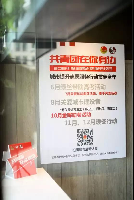 在志愿服务项目正式启动后,华百广场肯德基餐厅将设立“志愿服务招募信息墙”,定期发布由共青团济阳县委组织的志愿活动招募信息,消费者进店后可扫描信息墙上的二维码进入共青团济阳县委网站、浏览报名参加志愿服务活动,同时餐厅还将长期开展环卫工人关怀活动,随时欢迎环卫工人进店歇歇脚、喝杯水、热热饭。
