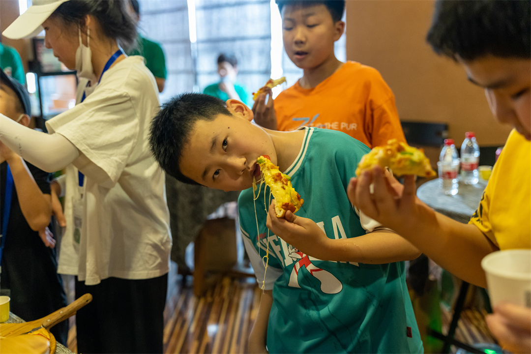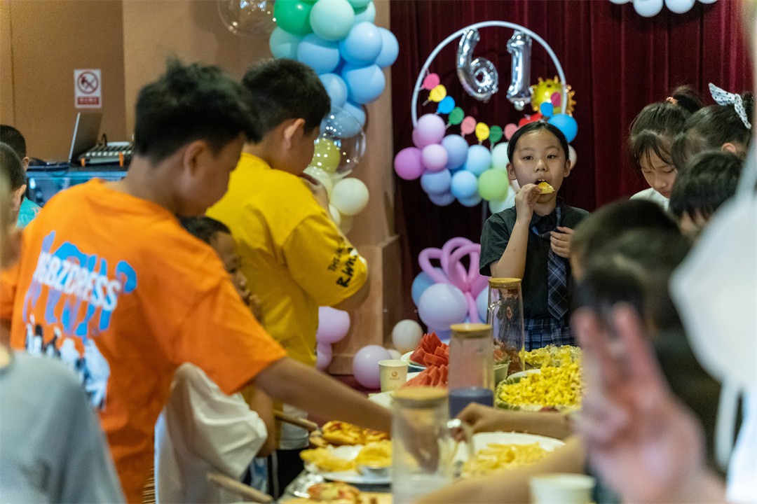公司为孩子们准备的美食、饮品与水果,摆满了长长的桌子。美味的披萨、司康、蛋挞、薯条让孩子们目不暇接,奶茶、水果饮品前,孩子们拿着自己的小杯子自觉排队选择自己喜欢的口味……