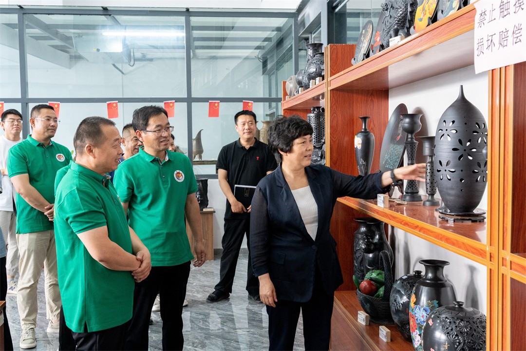 秦书记在视察龙格黑陶的过程中,对龙格黑陶的作品赞赏不已,感叹黑陶工艺之高超,从10厘米高的笔筒到2.4米高的作品,从最容易的雕刻到最难的掐丝,从单色到多彩……浸润着技艺传承人的执着追求。黑陶文化是黄河流域文化,以其深厚的历史底蕴和丰富的人文内涵,构成汉文化的渊源龙脉。黑陶是非物质文化遗产,是济阳靓丽的文化名片,龙格黑陶得以将这一伟大、丰厚、辉煌的非物质文化遗产延续传承,让其散发出更闪耀、更璀璨的光芒。她希望“龙格黑陶要将文化艺术与市场需求相结合,既能传承发扬,也要有市场认可。”