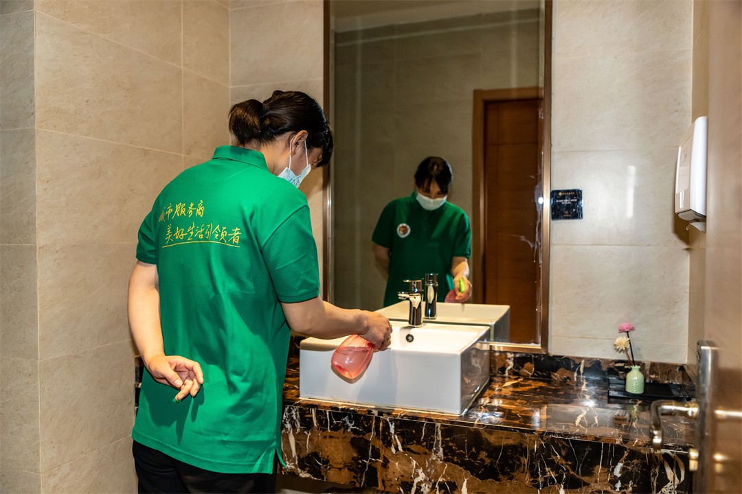 按照“全覆盖、无死角、无盲区、无空白”的原则,每天进行标准化、规范化全面消杀,确保消杀工作一处不漏,一处不缺。对于电梯等使用频率较高的空间,增加消杀次数。