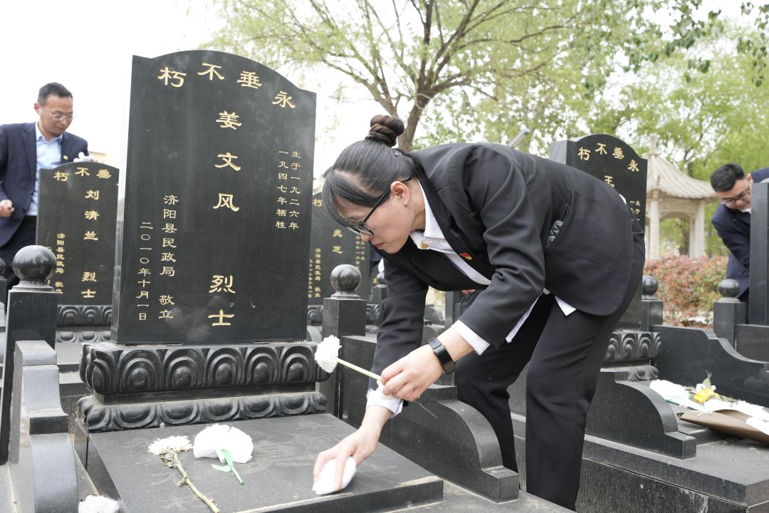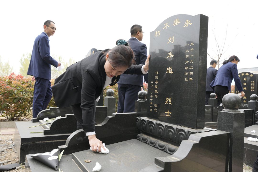 一块墓碑、一段往事、一串印记,诠释着一份沉甸甸的责任。大家在张总的带领下清扫烈士墓区,对烈士墓碑进行仔细擦拭,对墓碑周围的地面进行清扫,用实际行动缅怀革命先烈。