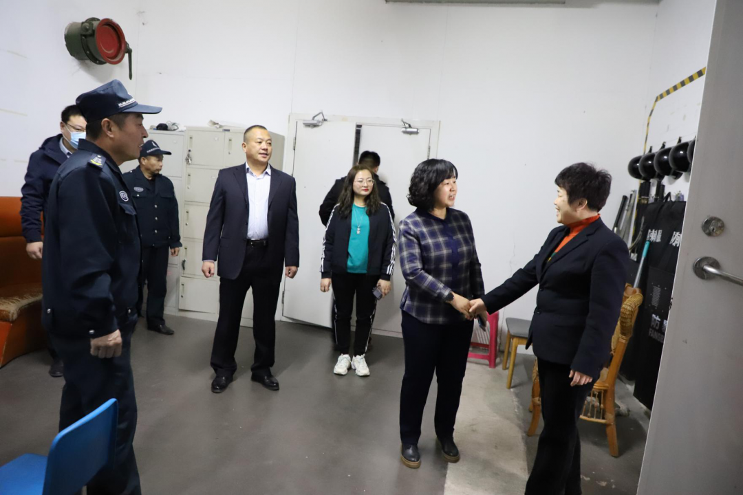 ▲在长田物业凤凰城项目部,常务副总张玲和济北街道党工委委员田淑云、新元社区书记李晨沟通交流