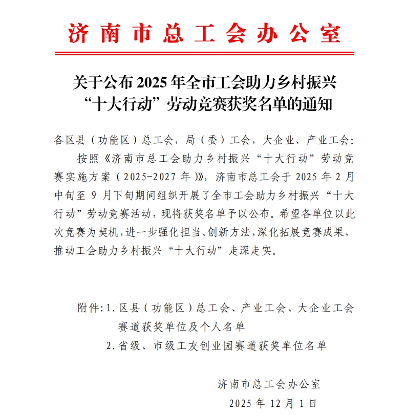 近日,2025年全市工会助力乡村振兴“十大行动”劳动竞赛获奖名单正式公布,济南长田实业有限公司成功斩获省级、市级工友创业园赛道一等奖。