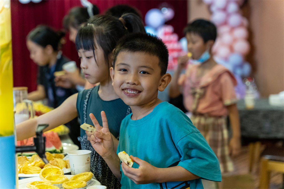 公司为孩子们准备的美食、饮品与水果,摆满了长长的桌子。美味的披萨、司康、蛋挞、薯条让孩子们目不暇接,奶茶、水果饮品前,孩子们拿着自己的小杯子自觉排队选择自己喜欢的口味……