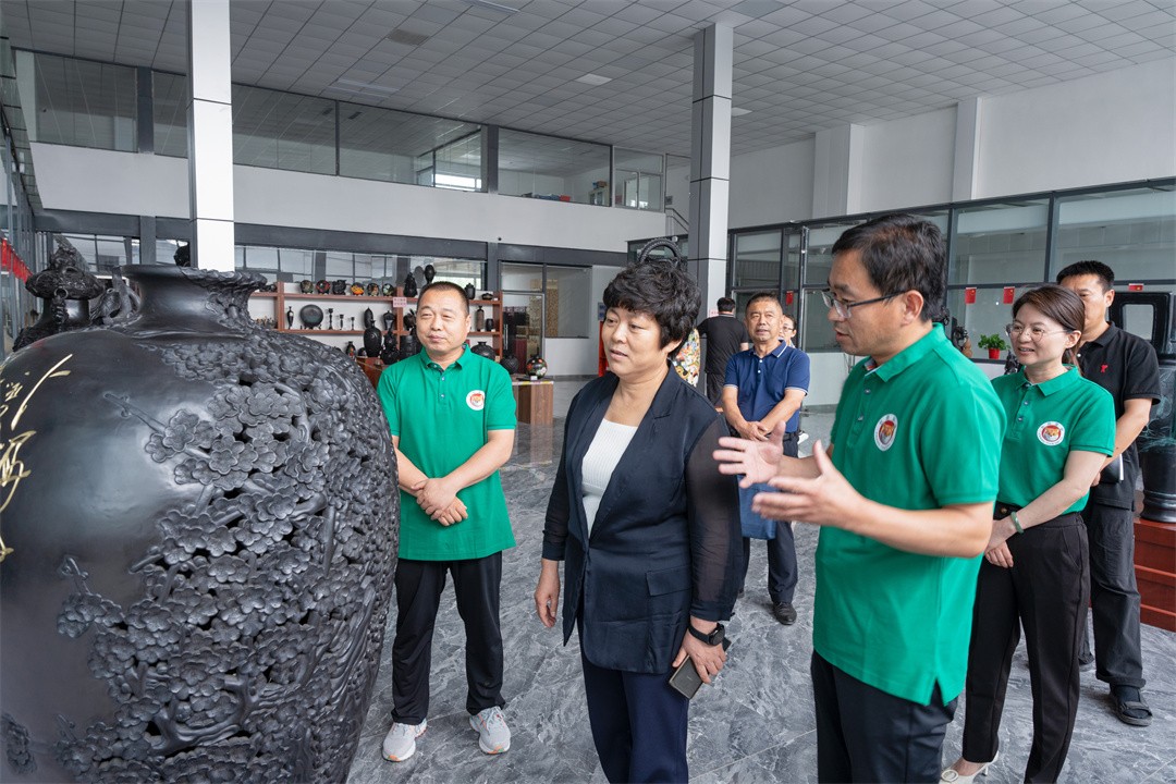 秦书记在视察龙格黑陶的过程中,对龙格黑陶的作品赞赏不已,感叹黑陶工艺之高超,从10厘米高的笔筒到2.4米高的作品,从最容易的雕刻到最难的掐丝,从单色到多彩……浸润着技艺传承人的执着追求。黑陶文化是黄河流域文化,以其深厚的历史底蕴和丰富的人文内涵,构成汉文化的渊源龙脉。黑陶是非物质文化遗产,是济阳靓丽的文化名片,龙格黑陶得以将这一伟大、丰厚、辉煌的非物质文化遗产延续传承,让其散发出更闪耀、更璀璨的光芒。她希望“龙格黑陶要将文化艺术与市场需求相结合,既能传承发扬,也要有市场认可。”